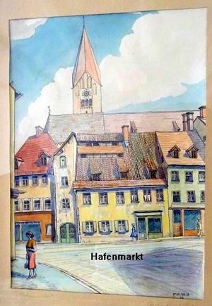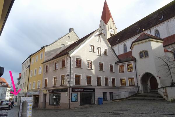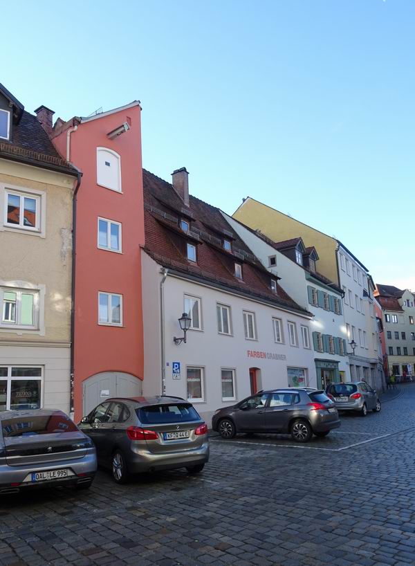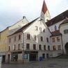 Das markante Geschäftsgebäude wurde die letzten Jahrzehnte von einem Farben und Malerbedarfs Verkaufsgeschäft genutzt und für dessen Zwecke teilweise intakt gesetzt. Die überbaute Fläche beträgt ca. 150m². Die Geschäftsräumlichkeiten sind von der Sichtseite Hafenmarkt begehbar. Durch das teilweise versetzte Gelände sind die Räumlichkeiten (1.OG) am Kirchplatz eben und mit weiteren 3 Hauseingängen zu begehen. Der Laubengang ist als kl. Freisitz nutzbar. Die Räume in den Obergeschoßen waren nicht bewohnt und müssten komplett saniert werden.